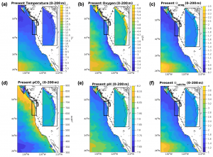 The team layered regional models with the Coupled Model Intercomparison Project 5 from the World Climate Research Programme to simulate multiple climate-associated stressors, including temperature, O2, pH, saturation state, and CO2, to create 100-year projections in the northern CCS. They used this “multi-model ensemble” to determine the degree to which changes in these stressors will be larger or smaller than those projected by global models. Findings are organized by the regions of coast that represent different ecological habitats.