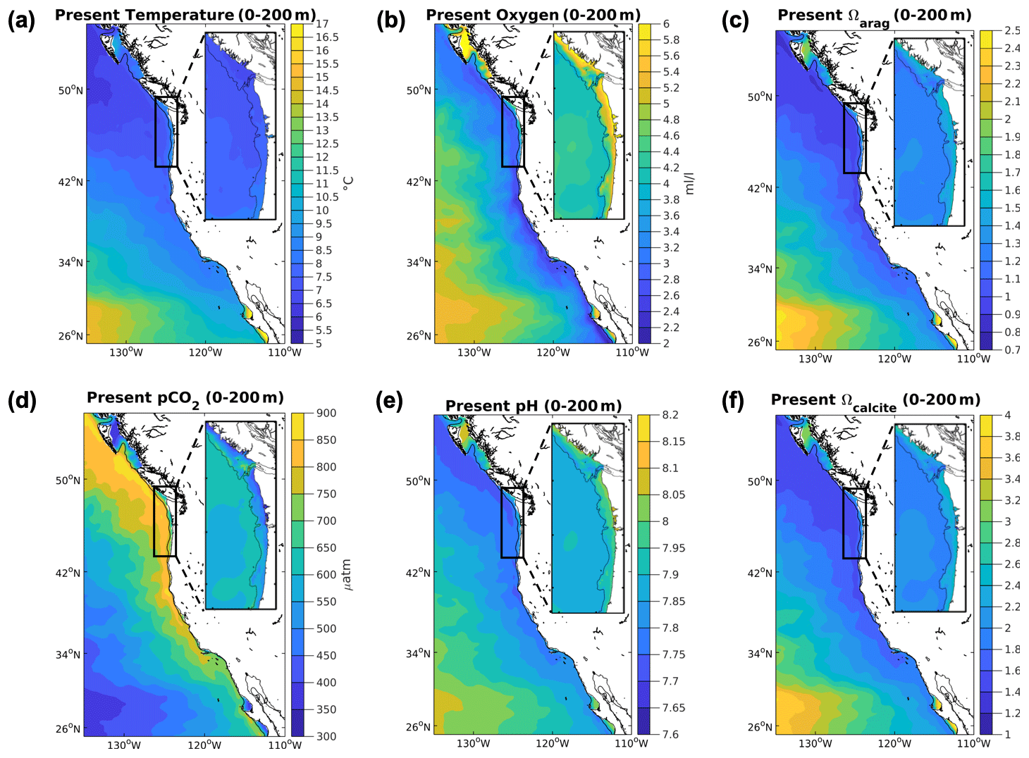 The team layered regional models with the Coupled Model Intercomparison Project 5 from the World Climate Research Programme to simulate multiple climate-associated stressors, including temperature, O2, pH, saturation state, and CO2, to create 100-year projections in the northern CCS. They used this “multi-model ensemble” to determine the degree to which changes in these stressors will be larger or smaller than those projected by global models. Findings are organized by the regions of coast that represent different ecological habitats.